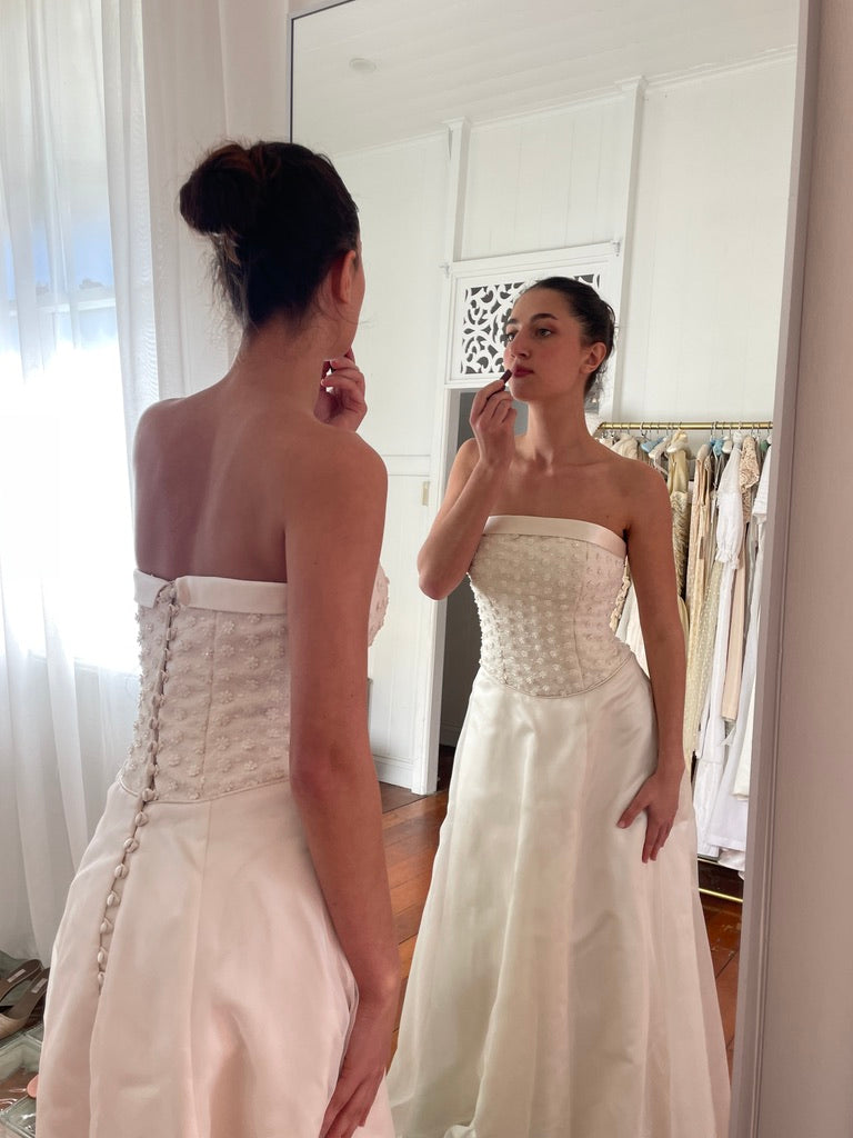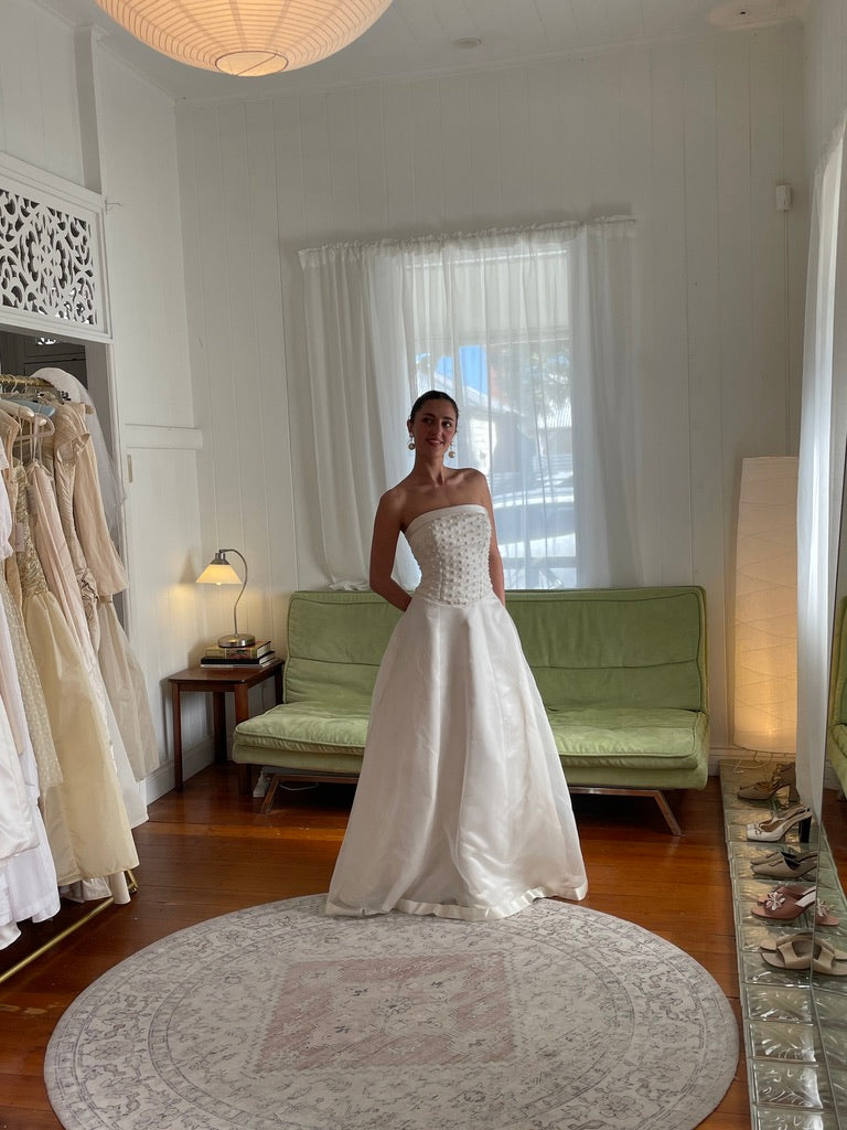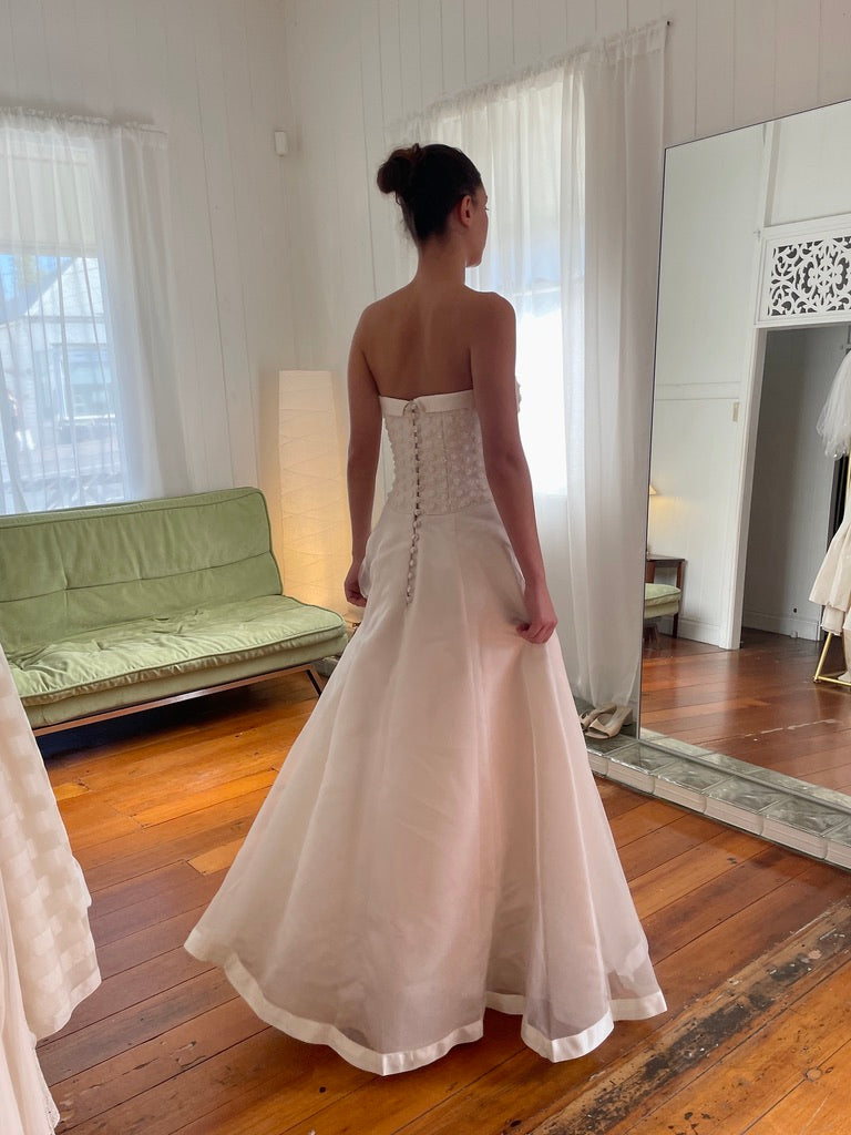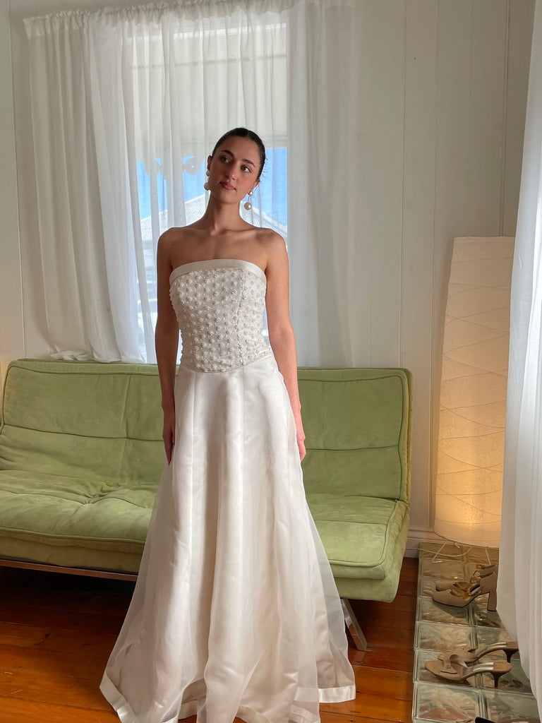 Vintage Y2K strapless a-line gown with floral detailing and satin ribbon trim